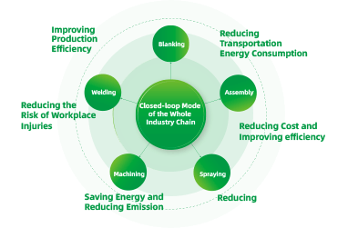 Toda a cadeia industrial trabalha em loop, utilizando a digitalização para orientar nossos processos tecnológicos, como corte automático, soldagem, usinagem, pulverização, montagem final etc., reduzindo os custos, aprimorando a qualidade e eficiência, além de promover a transformação ecológica e de baixa emissão de carbono.